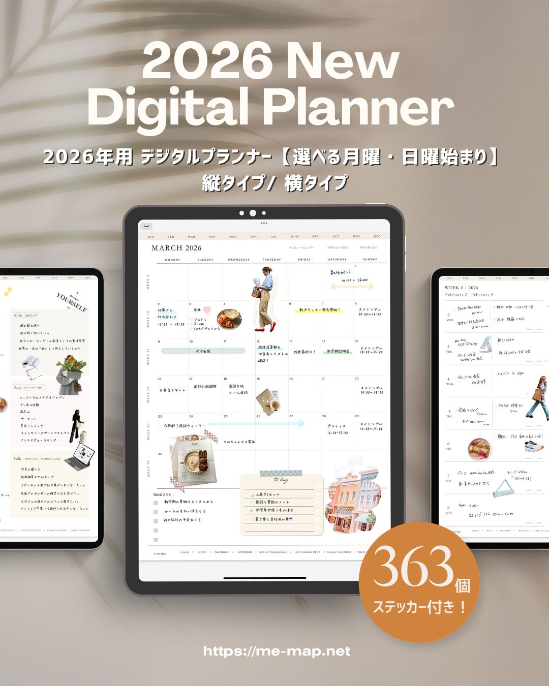 朝活のワークにもピッタリなDaily PlannerやWeekly Plannerはもちろん、暮らしの目標を毎月/毎週の予定に落と込むまでの全てのステップがセットになった『デジタルプランナー2026』大好評発売中です!